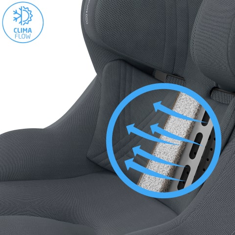 - Den är komfortabel året runt tack vare bilbarnstolens ClimaFlow-ventilationspaneler, andningsbart skum och meshtyger som håller ditt barn svalt, fräscht och bekvämt.