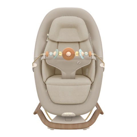 Babysitter och leksaksbåge fungerar tillsammans som en helhetslösning för lek, lugn och utveckling i ett enda paket.